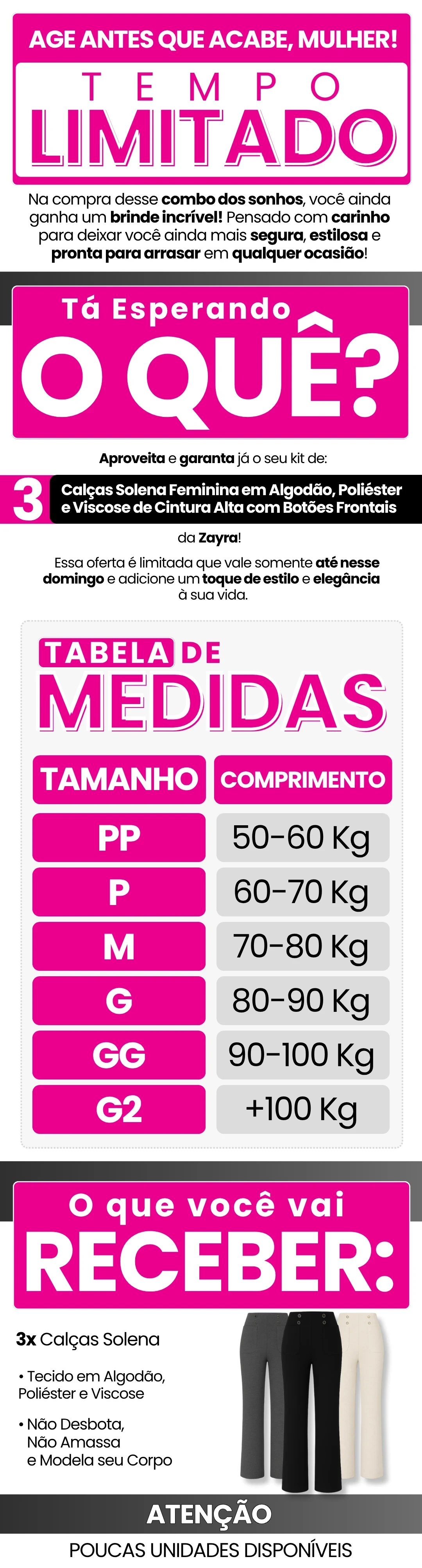 Cintura alta que abraça e afina, pernas largas para um caimento impecável, nada apertando, nada marcando. Ela simplesmente se encaixa em você, seja qual for seu corpo. Vista, se olhe no espelho e sinta o orgulho de estar linda, arrumada e poderosa — sem esforço, sem sacrifício. Se permita viver essa sensação todos os dias!