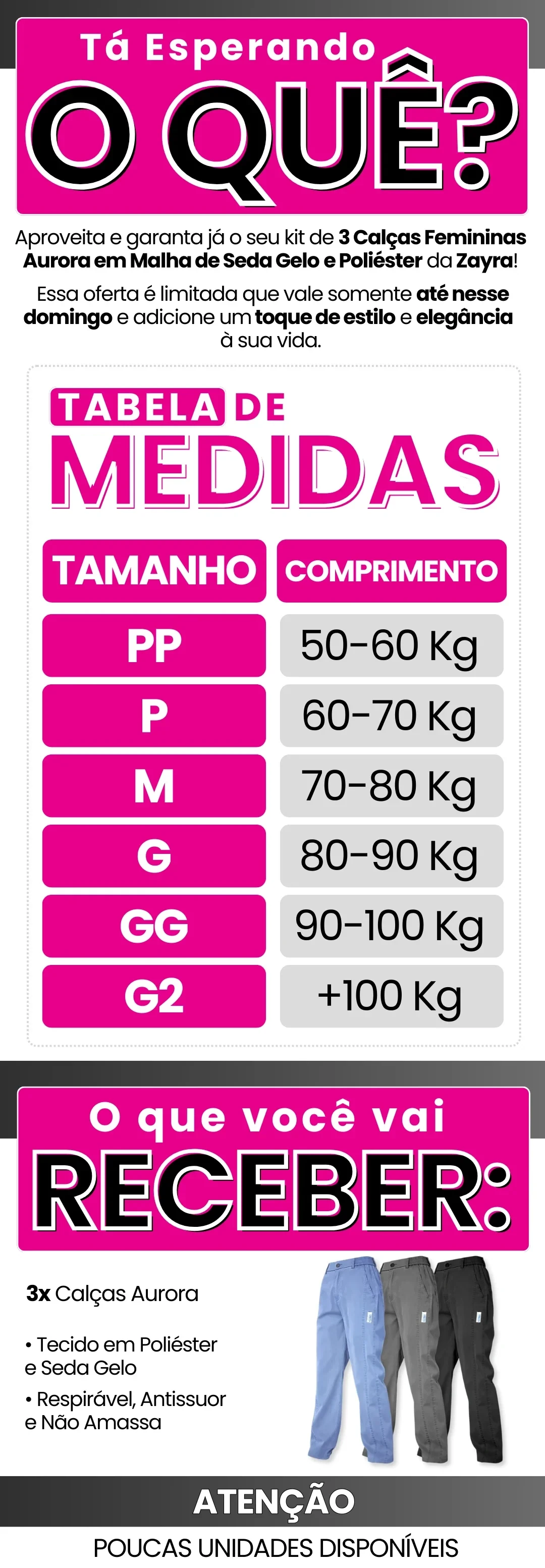 Se você busca conforto, elegância e um caimento impecável, acabou de encontrar! Essa calça é feita para mulheres que não aceitam menos do que o melhor. Mas atenção: estoque limitado! Não perca tempo, porque quem demora para decidir acaba ficando sem. Garanta a sua agora!